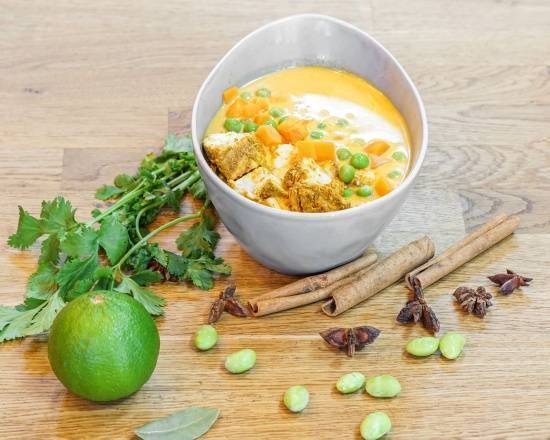Kawałki kurczaka lub tofu w białej soczewicy w lekko kwaskowym sosie na bazie pomidorów i indyjskiej przyprawy garam masala z dodatkiem edamame, czosnku, imbiru oraz aromatycznej kurkumy (270g), z ryżem basmati o korzennej nucie (190g) i surówką colesław (150g). -